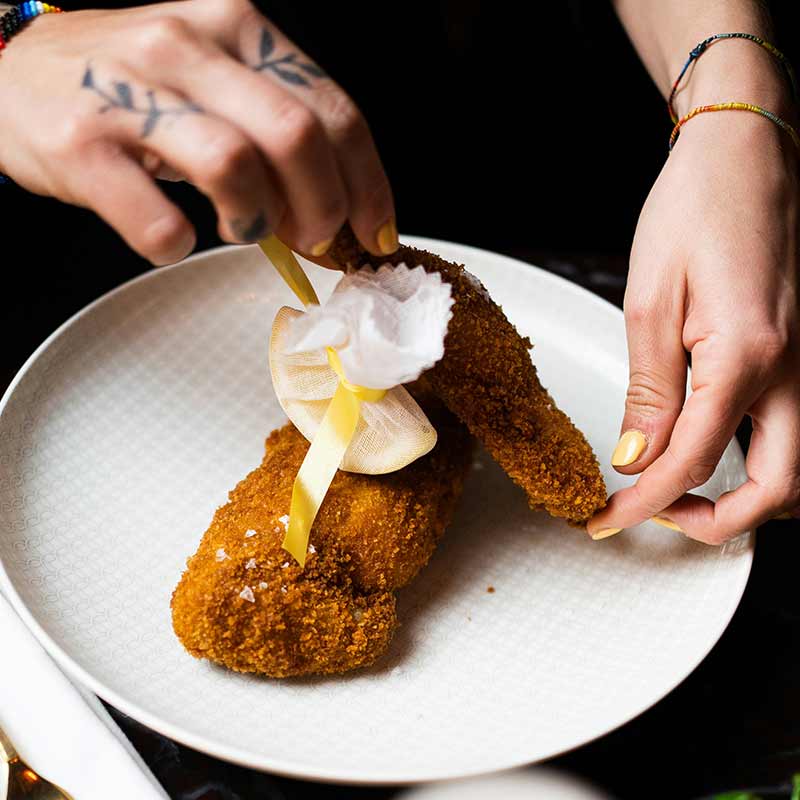 in goldener, luftig-knuspriger Panade ausgebacken,